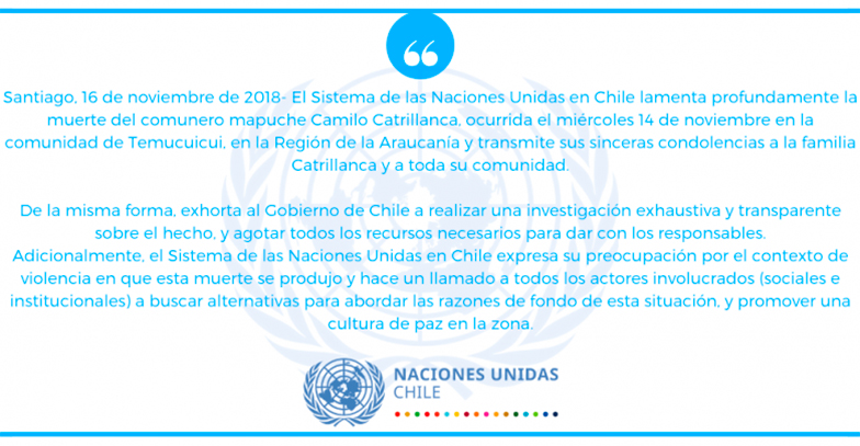 En esa línea, el Sistema de las Naciones Unidas en Chile "lamenta profundamente la muerte del comunero mapuche Camilo Catrillanca" y envió sus "sinceras condolencias a la familia Catrillanca y a toda su comunidad".