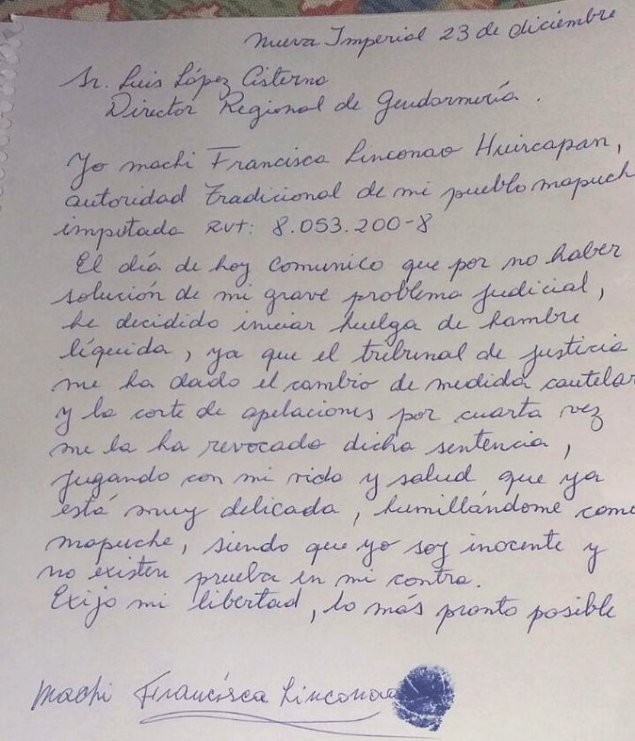 "Exijo mi libertad lo más pronto posible", finaliza el escrito, en que la mujer se identifica como "machi Francisca Linconao Huircapán, autoridad tradicional de mi pueblo mapuche".