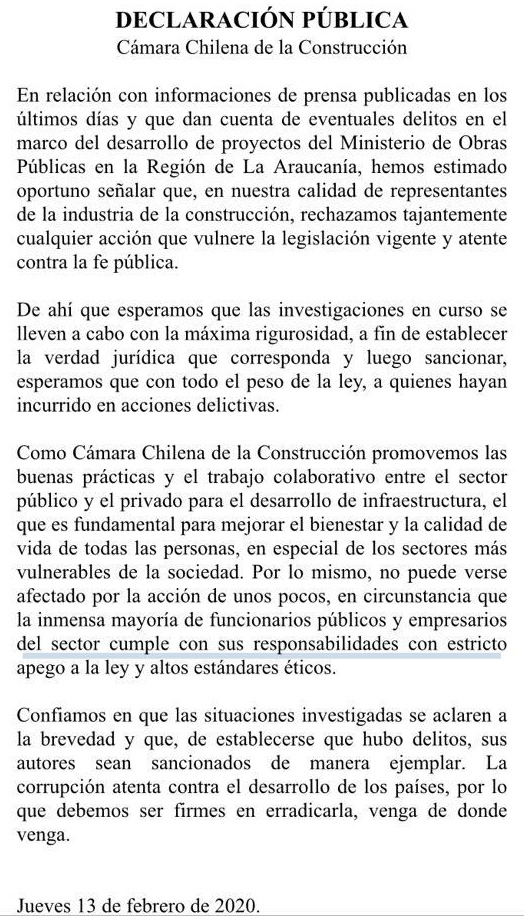 Desde la Cámara Chilena de la Construcción también salieron a referirse a la situación, manifestando su rechazo "tajante" contra "cualquier acción que vulnere la legislación vigente y atente contra la fe pública".