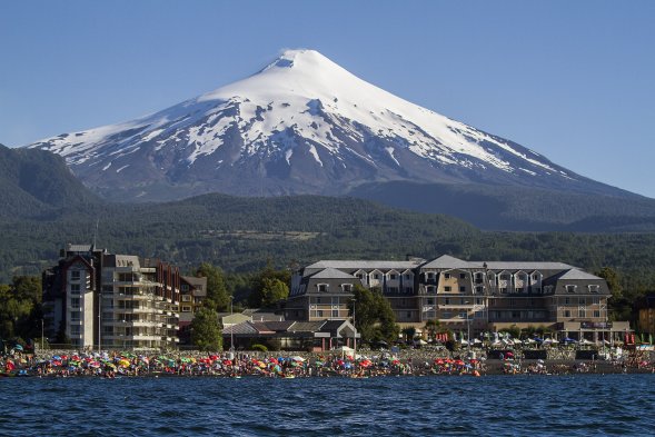 Centenares de turistas visitan la Playa Grande de Pucón, en la Región de La Araucanía, donde pueden disfrutar de bicicletas acuáticas, kayak y apreciar de fondo la vista del Volcán Villarrica.