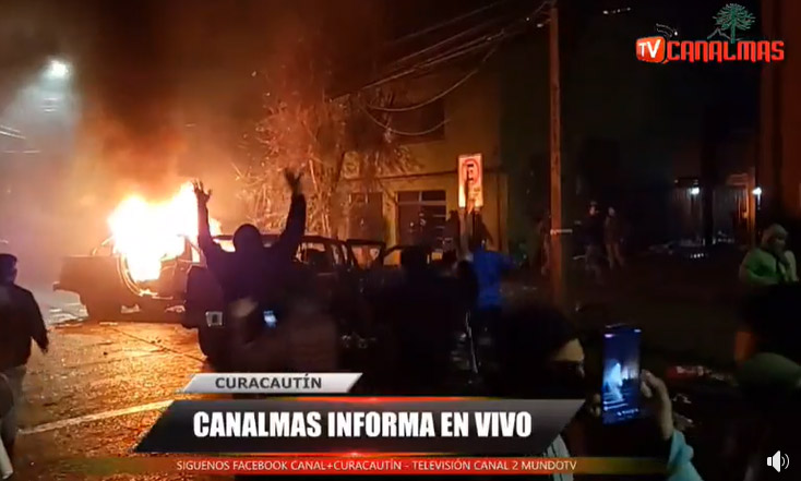 Sujetos celebran el momento en que el fuego avanza en una de las camionetas que pertenecerían a los comuneros. (Captura: CanalMas Curacautín).