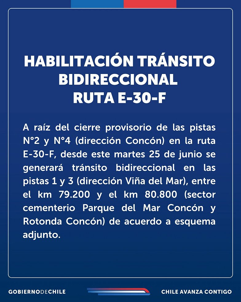 "Hemos procedido a abrir la bidireccionalidad de la ruta E-30-F en la bajada hacia Concón. Esto como una medida (temporal) de prevención por la socavación que se produjo en el sector, mientras nuestros equipos de ingeniería desarrollan la solución definitiva lo antes posible", dijo Riquelme.