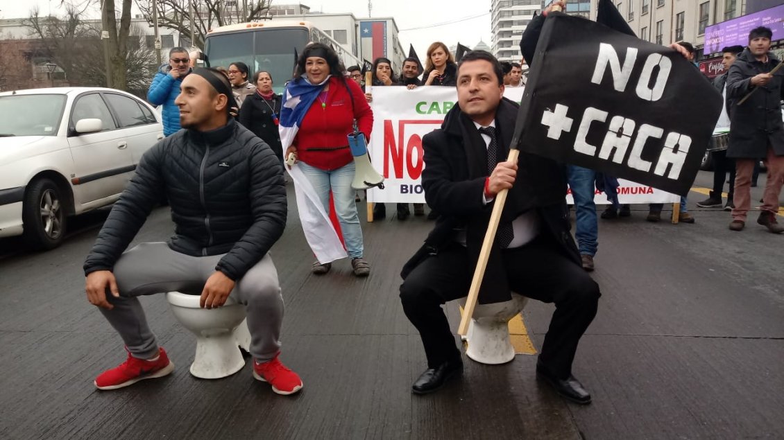 Mario Gierke, alcalde de Cabrero, encabezó una protesta en Concepción sentado en un water contra ampliación de planta de lodos orgánicos de Biodiversa, Essbio. El Servicio de Evaluación Ambiental entregó una recomendación favorable para la ampliación en 127 metros cuadrados de la planta en la que de las actuales 28 pasará a procesar 120 toneladas de lodos que son tratados en la comuna de la región del Biobío. Esto podría generar más moscas, ratones y malos olores acusan los vecinos.