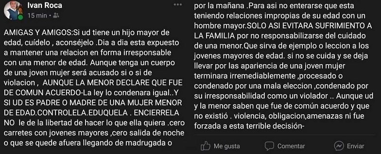 El edil usó su cuenta de Facebook para minimizar la responsabilidad del sujeto y trasladarla a la niña y a sus padres: "Si ud tiene un hijo mayor de edad, cuídelo, aconséjelo... Día a día está expuesto a mantener una relación en forma irresponsable con una menor de edad. Aunque (ésta) tenga un cuerpo de una joven mujer, será acusado sí o sí de violación", escribió.