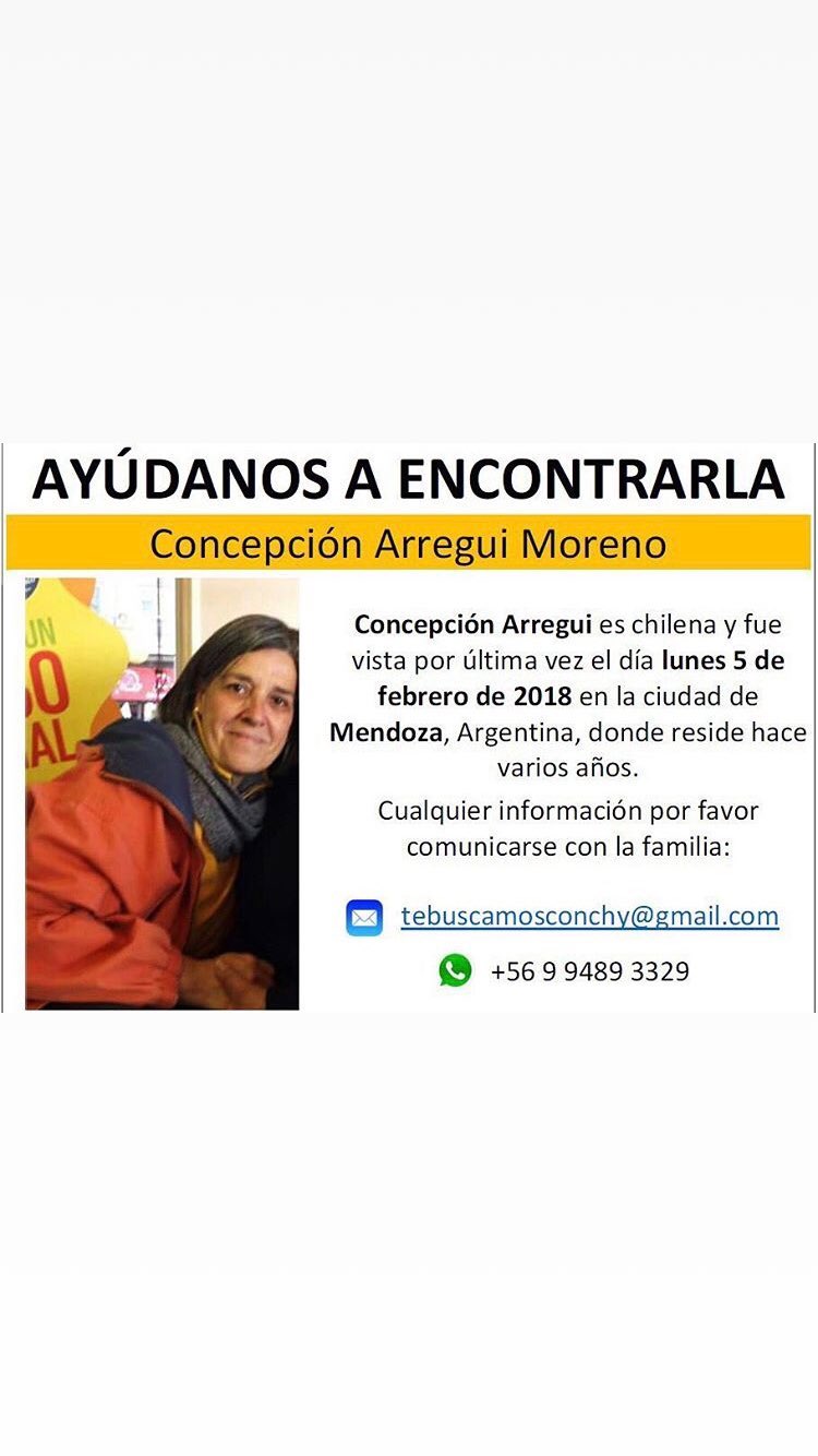 A través de sus redes sociales las artistas que son madre e hija publicaron una infografía para recopilar información sobre el paradero de Concepción Arregui, la prima de Carolina a la que se le perdió la pista el pasado 5 de febrero en la ciudad de Mendoza.