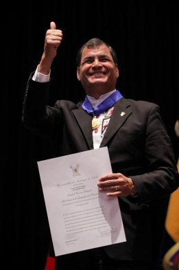 En medio de protestas, el Presidente del Ecuador, Rafael Correa, recibió el grado de Doctor Honoris Causa por parte de la Universidad de Santiago, en consideración a la reforma que ha impulsado con el propósito de mejorar la calidad de la educación básica, secundaria y superior en su país.