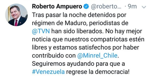 Inicialmente el canciller Ampuero publicó que "tras pasar la noche detenidos por el régimen de Maduro, periodistas de TVN han sido liberados".