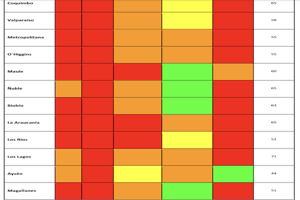 En esa misma línea, las universidades indicaron que todas las regiones del país se mantienen con una carga de la enfermedad en color rojo, lo que significa que se registran 10 casos nuevos por cada 100 mil habitantes.