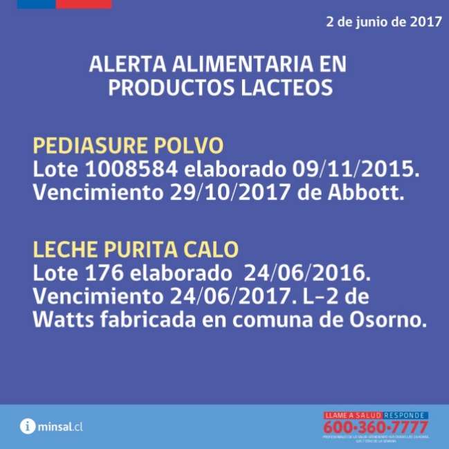 Los productos afectados corresponden a la leche Pediasure del Laboratorio Abbott, del lote 1008584, elaborado en noviembre de 2015 y con fecha de vencimiento el 29 de octubre de 2017, y el otro es la leche purita Calo, del lote 176, elaborado el 24 de junio de 2016 y que vence el 24 de junio de 2017.