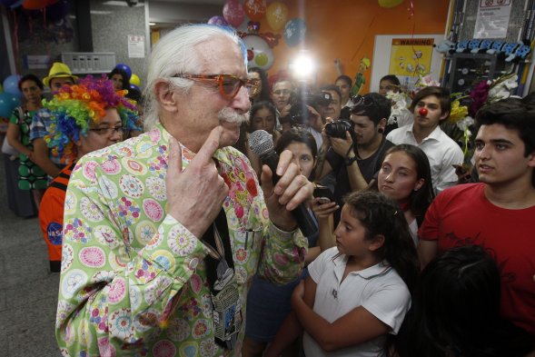Patch Adams, el reconocido medico estadounidense, inauguró el centro Anestimagen en San Miguel. En el lugar un grupo de profesionales de la salud, aplicó dosis de humor en sus pacientes, lo que redujo la necesidad de anestesia en diversos exámenes. Christian Iglesias/Aton Chile