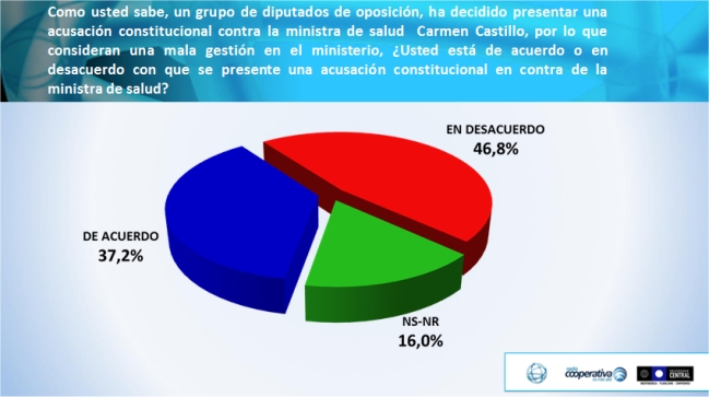 Ante la crisis en el ámbito de la salud, el sondeo reveló que un 47 por ciento rechaza o está en desacuerdo con la acusación constitucional impulsada por la oposición contra la ministra de Salud, Carmen Castillo.