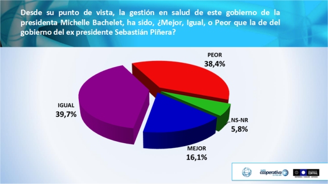 Dos tercios de los encuestados, un 72,8 por ciento, dicen que la Presidenta Michelle Bachelet no ha cumplido con sus promesas en materia de salud, mientras que una mayoría asegura que este Gobierno ha tenido un desempeño "igual" (39,7 por ciento) o "peor" (38,4 por ciento) a la administración de Sebastián Piñera en esta materia.