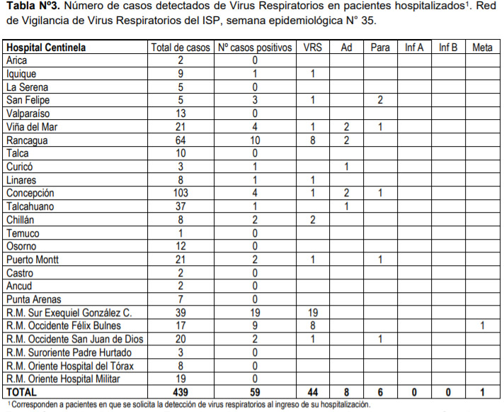 Asimismo, de un total de 439 pacientes hospitalizados en el país en la semana N°35, y para los cuales se solicitó la detección de virus respiratorios, 59 arrojaron positivo, 48 de ellos al virus sincicial: la mayoría, 28, en la Región Metropolitana.