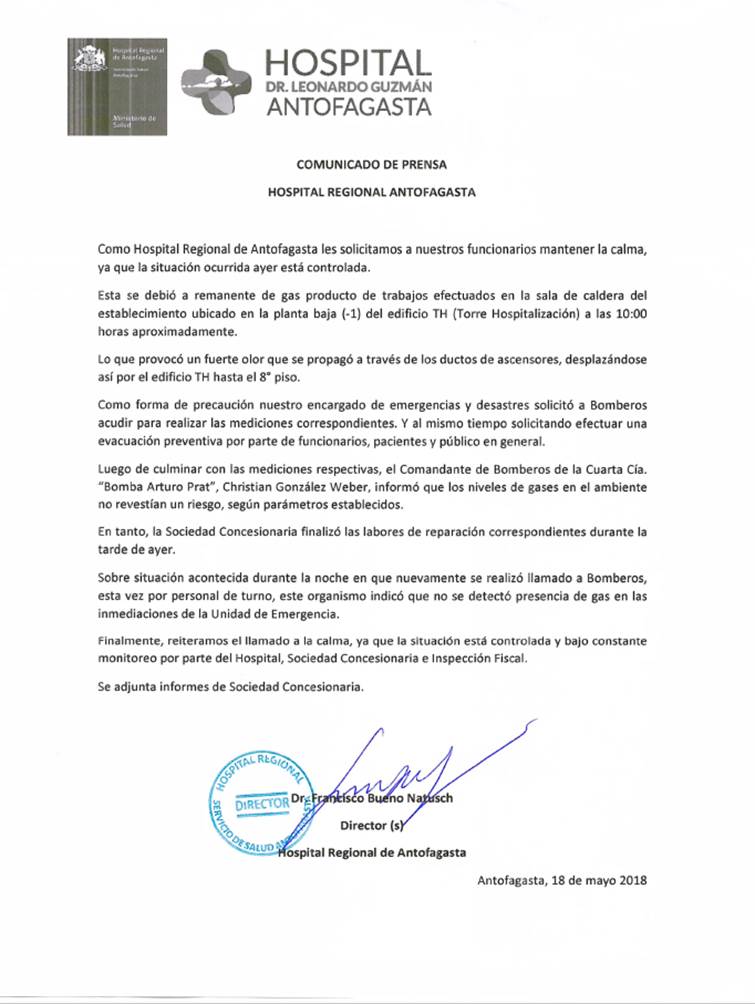 A través de un comunicado difundido este viernes, el Hospital Regional de Antofagasta llamó a sus trabajadores a "mantener la calma", luego de las dos evacuaciones por gas vividas durante las últimas 24 horas.