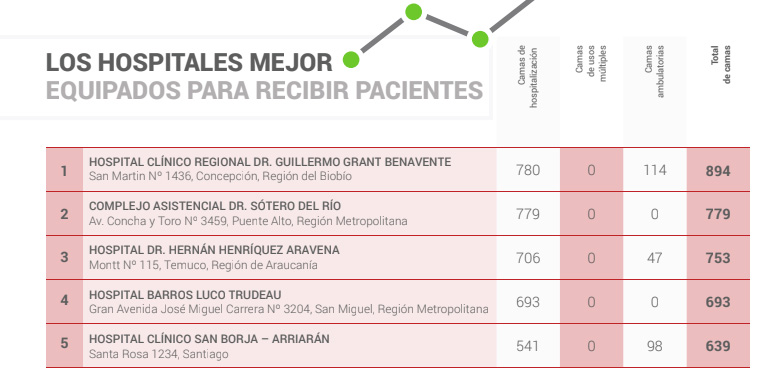 El primer tópico es el equipamiento para recibir pacientes, donde lidera el Hospital Regional del Biobío Dr. Guillermo Grant, en Concepción; seguido por el Sótero del Río, de Puente Alto, y el Hernán Henríquez Aravena de Temuco.
