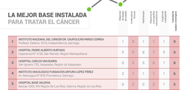 Respecto a la mejor base instalada para tratar el cáncer, el mejor equipado es el Instituto Nacional del Cáncer, ubicado en la comuna de Independencia, seguido del Hospital Padre Alberto Hurtado, emplazado en San Ramón, y el Van Büren.