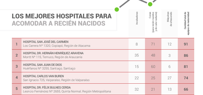 La última categoría analizó los mejores recintos para acomodar a recién nacidos, donde el Hospital de Copiapó fue ubicado en el primer lugar. Le siguen el Hospital de Temuco y el San Juan de Dios, en Santiago.