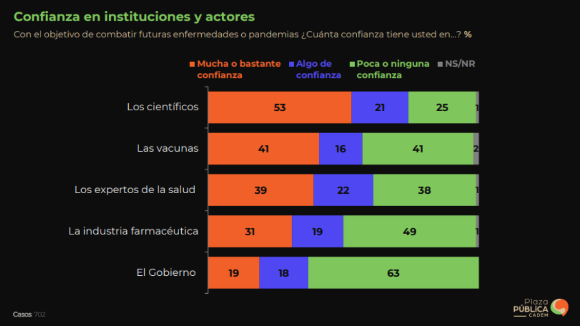 Sin embargo, al ser consultados sobre qué instituciones o actores son confiables en caso de una nueva pandemia, el 41% declara tener "poca o ninguna confianza" en las vacunas.