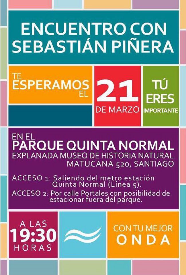 Finalmente se confirmó que el acto masivo de lanzamiento de la candidatura presidencial de Sebastián Piñera será este martes a partir de las 19:30 horas en el Parque Quinta Normal, en Santiago.