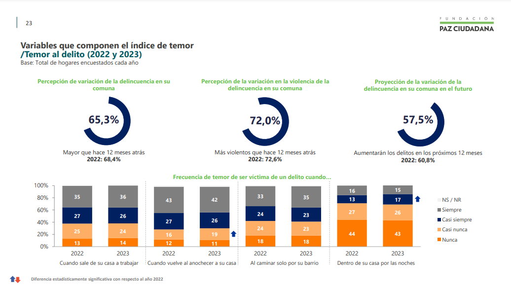 El temor de las personas a ser víctima de la delincuencia aumentó nuevamente este año, alcanzando el nivel más alto desde que la fundación Paz Ciudadana lleva registro, de acuerdo a los resultados de su Índice Paz Ciudadana 2023, estudio que se realizó a partir de 1.800 entrevistas telefónicas y presenciales.