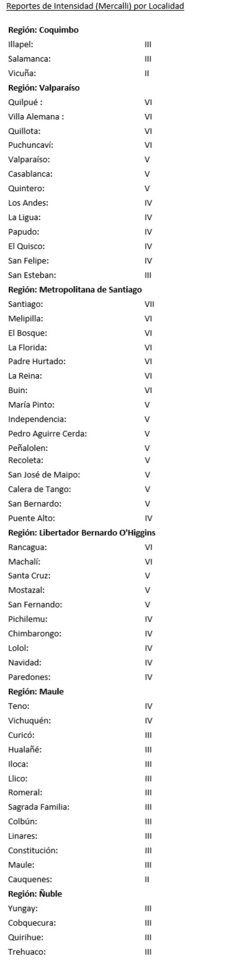El Servicio Nacional de Prevención y Combate de Desastres (Senapred), por su parte, calificó el sismo de "mayor intensidad" y detalló que, según la escala internacional de Mercalli, que va del I al XII, se percibió con las siguientes intensidades: