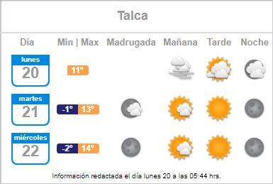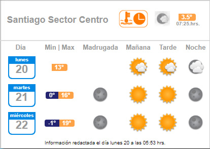 La meteoróloga de turno, Michelle Muñoz, explicó que "entre el martes y miércoles se prevén temperaturas mínimas bajas para la época: en Santiago estimamos mínimas que pueden llegar a uno bajo cero el día miércoles, 2 o 3 bajo cero en algunos sectores como Colina; en otras regiones, en el Maule esperamos la mínima de 2 bajo cero el miércoles".