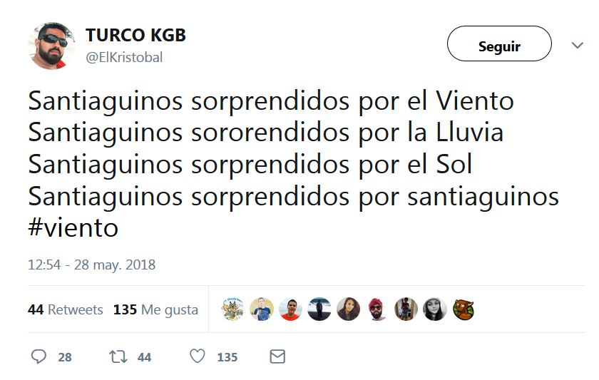 Varios usuarios de redes sociales se tomaron con humor el sistema frontal que afecta a la zona centro-sur de Chile. Por ello, no tardaron en llegar las bromas contras los santiaguinos por sus reacciones al fuerte viento, que ha causado caídas de árboles, muros, vidrios y cortes de luz. De hecho, la palabra #viento se convirtió en tendencia de Twitter.