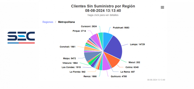13:15 - | En la Región Metropolitana, las comunas más afectadas por los cortes de luz son Lampa (14.729 hogares), Colina (6.340), Pudahuel (5.683), Maipú (5.472) y Pirque (3.714)