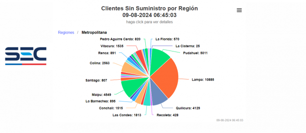 06:43 - | En la Región Metropolitana, las comunas más afectadas por los cortes de luz son Lampa (10.885 hogares), Pudahuel (5.011), Maipú (4.549) y Colina (2.563)