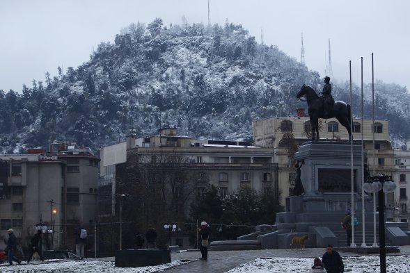 Santiago y sus alrededores amaneció este sábado cubierto por una capa de nieve. El fenómeno que es más común en sectores precordilleranos de la capital se extendió hacia el centro y se vieron lugares como Plaza Baquedano, el Palacio de La Moneda, el cerro Santa Lucía y el Estadio Nacional bajo la blanca capa.