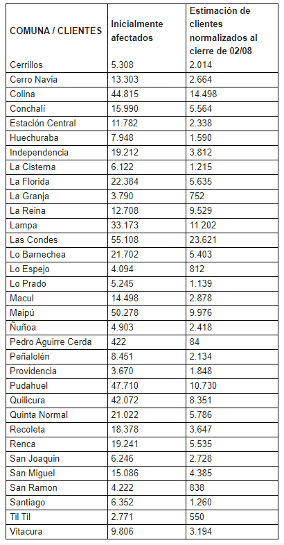 | Enel Distribución: Hay 408.950 mil clientes se encuentran sin suministro, principalmente en las comunas de Pudahuel, Maipú, Quilicura, Lampa, Recoleta, Las Condes y Renca