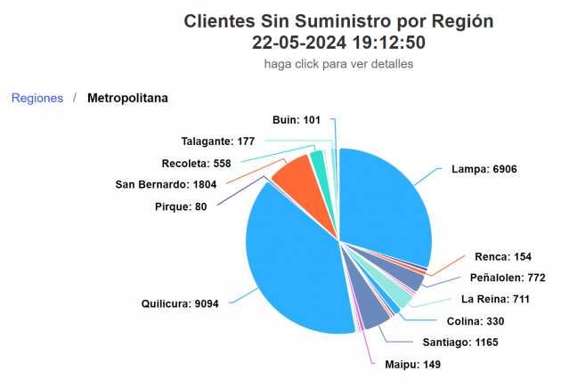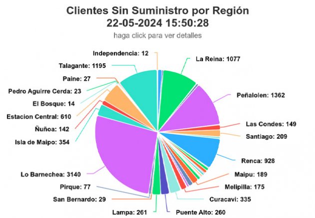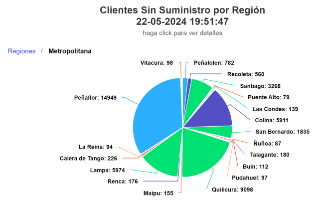 13:45 - | Más de 15 mil clientes están sin luz en la Región Metropolitana, según la SEC. Las comunas más afectadas son Melipilla, Lo Barnechea y Maipú.