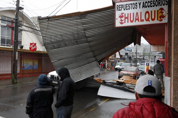 Una techumbre cayó producto del fuerte viento y lluvia, afectando a dos autos en pleno centro de Concepcion. El hecho no dejó personas lesionadas, pero originó un corte de tránsito y luz en el sector. Según testigos, el accidente habría sido provocado por un rayo.