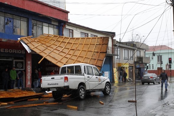 Una techumbre cayó producto del fuerte viento y lluvia, afectando a dos autos en pleno centro de Concepcion. El hecho no dejó personas lesionadas, pero originó un corte de tránsito y luz en el sector. Según testigos, el accidente habría sido provocado por un rayo.