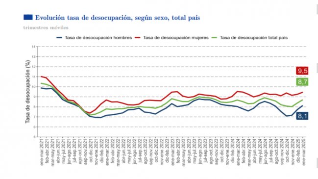 La cesantía en Chile en el trimestre móvil enero-marzo de 2025 fue de 8,7%, son mostrar variación en 12 meses, "debido a que el alza de la fuerza de trabajo (0,9%) fue igual a la presentada por las personas ocupadas", detalló el Instituto Nacional de Estadísticas de Chile (INE).