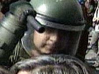 12:32 Canal 13 emite imágenes de hace una hora y media atrás, que muestran claramente cómo un efectivo de Fuerzas Especiales de Carabineros golpea en la nuca con un bastón retráctil al senador Alejandro Navarro, quien comienza a sangrar profusamente.