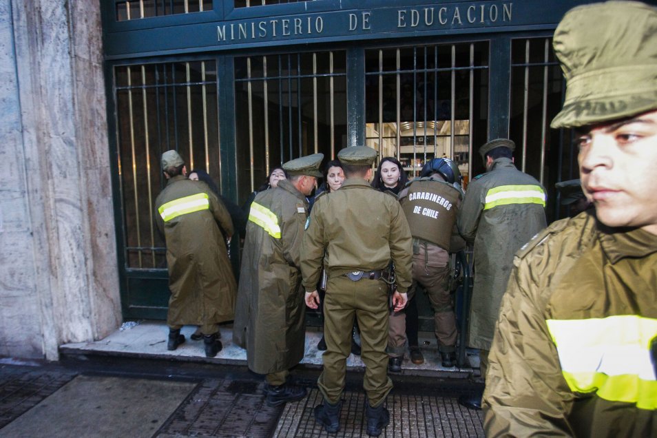 Un grupo de estudiantes secundarios y universitarios se encadenó al frontis del edificio del Ministerio de Educación como protesta en contra del Estatuto Laboral Juvenil. La manifestación provocó una rápida reacción de Carabineros que detuvo a cerca de una decena de personas.