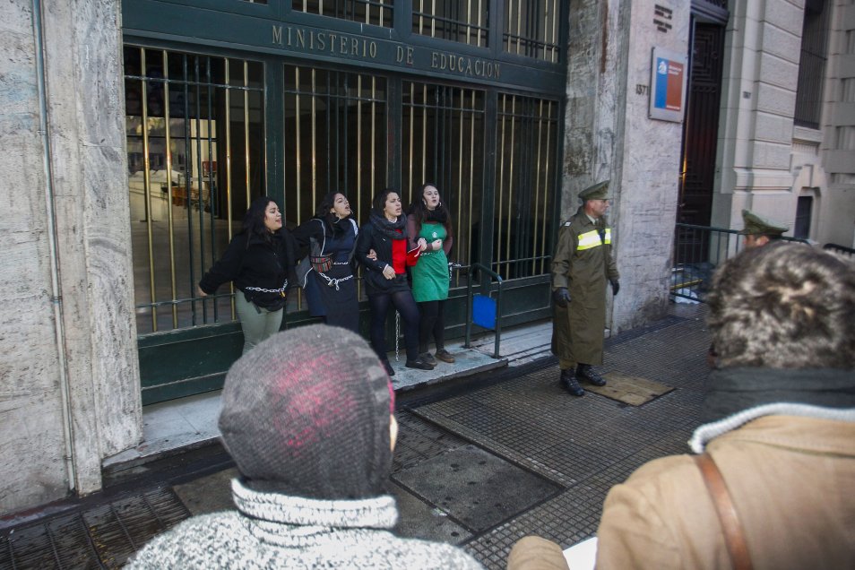 Un grupo de estudiantes secundarios y universitarios se encadenó al frontis del edificio del Ministerio de Educación como protesta en contra del Estatuto Laboral Juvenil. La manifestación provocó una rápida reacción de Carabineros que detuvo a cerca de una decena de personas.