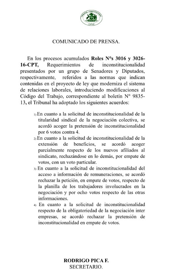 En tanto, respecto a la extensión de beneficios, el tribunal declaró inconstitucional el extender los beneficios a los nuevos afiliados al sindicato, "rechazándose en lo demás por empate de votos, con un voto en particular".
