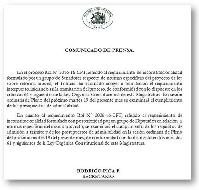 El Tribunal Constitucional acogió a trámite el requerimiento que presentaron la semana pasada parlamentarios de Chile Vamos en contra de la reforma laboral impulsada por el Gobierno.