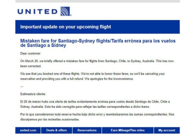 El sitio web de la aerolínea United Airlines vendió este lunes pasajes desde Chile y Argentina hacia Sydney, Australia, a un muy bajo costo -entre 100 mil y 200 mil pesos chilenos- algo así como el 10 por ciento del valor del pasaje normal.