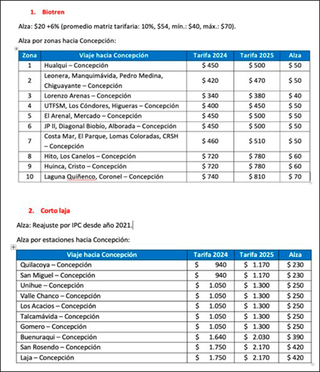 El gerente general, Nelson Hernández Roldán, dijo que "a partir del jueves 2 de enero las tarifas del Biotrén experimentarán un alza de 20 pesos base más el 6% según origen para destino, por ejemplo, el tramo entre Coronel - Concepción tendrá un valor de 810 pesos. Esta será la única alza durante el año 2025. También, el servicio Corto Laja tendrá un alza promedio de 206 pesos. Estas tarifas no tenían modificación desde el 2019. Ambos servicios, siguen siendo los más convenientes para los pasajeros de la región del Biobío", comentó el ejecutivo.