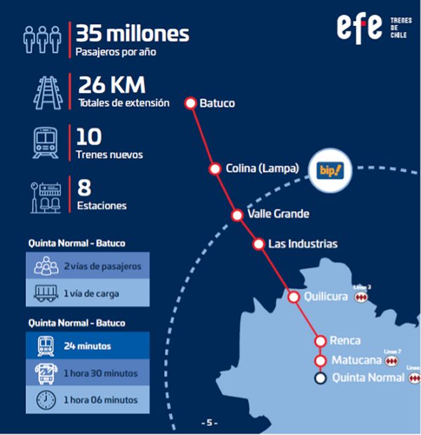 El proyecto tren Santiago-Batuco espera beneficiar a los habitantes de Lampa, Quilicura, Renca, Quinta Normal y Santiago, con un ahorro de más de dos horas diarias de tiempo de viaje; y considera ocho estaciones en un trayecto de 26 kilómetros, con tres vías hasta la estación Las Industrias (dos de pasajeros y una de carga) y dos hasta Batuco (una de pasajeros y una de carga), así como conexiones con las líneas 3, 5 y 7 de Metro.