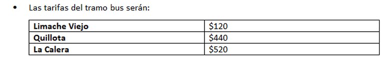 Finalmente, en el caso de los buses de combinación de la intermodal de Limache, la tarifa del tramo bus -que se suma al tramo tren- aumentará 20 pesos a Limache Viejo, mientras que a Quillota y La Calera el aumento será de 40.