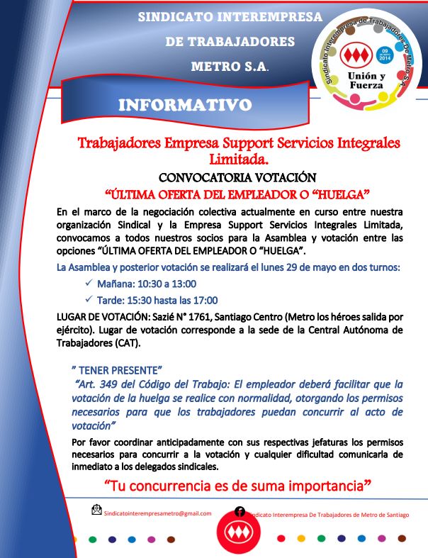 Los trabajadores de la empresa Support Servicios Integrales Limitada, que corresponde a guardias y asistentes de las Líneas 2 y 5 del Metro de Santiago, votarán este lunes la opción de ir a huelga en el marco de una negociación colectiva que discuten con su empleador.