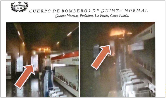 El detalle está contenido en el oficio N° 75 que Bomberos de Quinta Normal remitió al Ministerio Público el 16 de diciembre pasado respecto del siniestro que fue atendido por un equipo especializado de la institución bomberil que recibió el primer llamado a las 17:58 horas de aquel día de octubre, cuando ya regía estado de emergencia en Santiago.