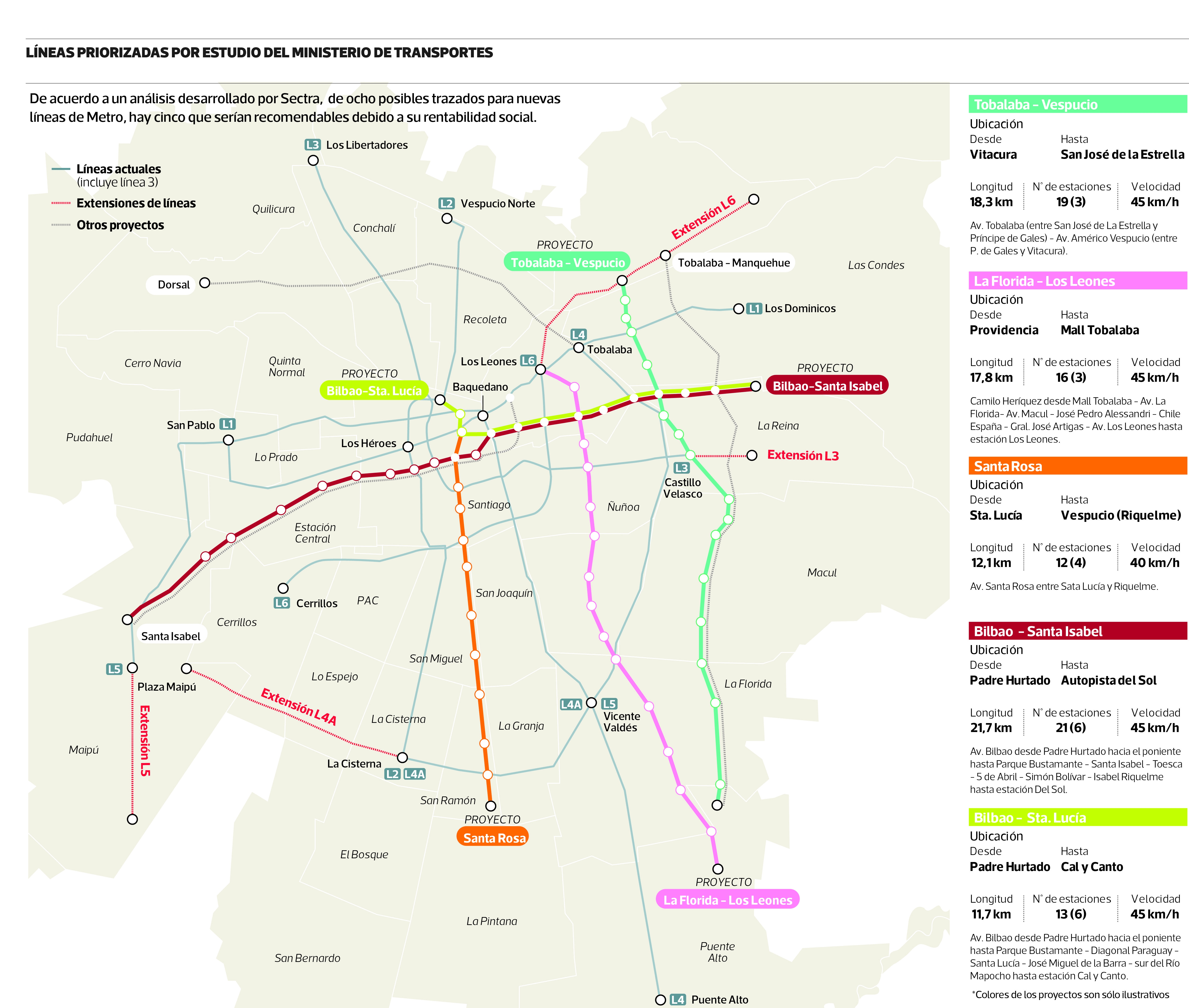 La más larga de las eventuales futuras líneas de Metro -según este análisis del Ministerio de Transportes que detalla el matutino- es la que iría entre Bilbao y Padre Hurtado hasta la Estación Del Sol de la Línea 5, ubicada en Pajaritos con la Autopista del Sol.
