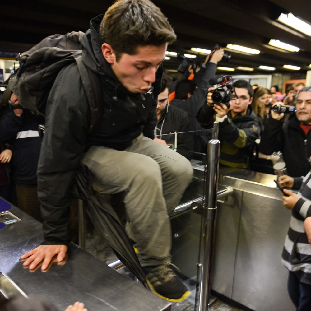 Un grupo de entre 30 a 50 personas ingresó sin pagar a la estación Baquedano del Metro en protesta por el alza de tarifas que entró en vigencia este lunes.