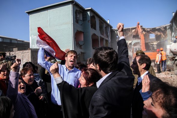 Avanzan las obras de demolición de los primeros 24 departamentos de la Población Francisco Coloane, en el sector Bajos de Mena de Puente Alto, como parte del Programa Recuperación de Condominios Sociales. Vecinos descontentos con las compensaciones del Minvu se manifestaron en el lugar.