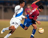 ![]() Eros Pérez disputa un balón con el local Víctor Miranda. (Foto: EFE) |